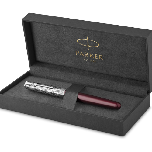 PARKER Sonnet Fountain Pen | Premium Metal and Red Satin Finish with Chrome Trim | Fine 18k Gold Nib with Black Ink Cartridge | Gift Box