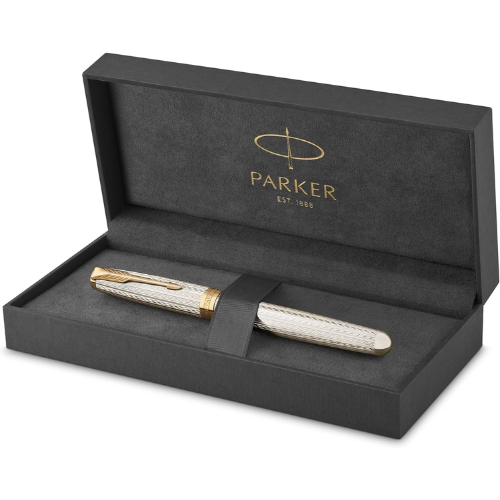 Parker Sonnet Fountain Pen Chiseled Silver with Gold Trim Solid 18k Gold Fine Nib (1931489)